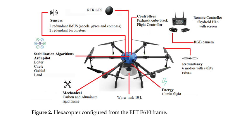 In Figure 2 of the article (p. 5), you can see the base drone, originally designed for agricultural spraying, with: